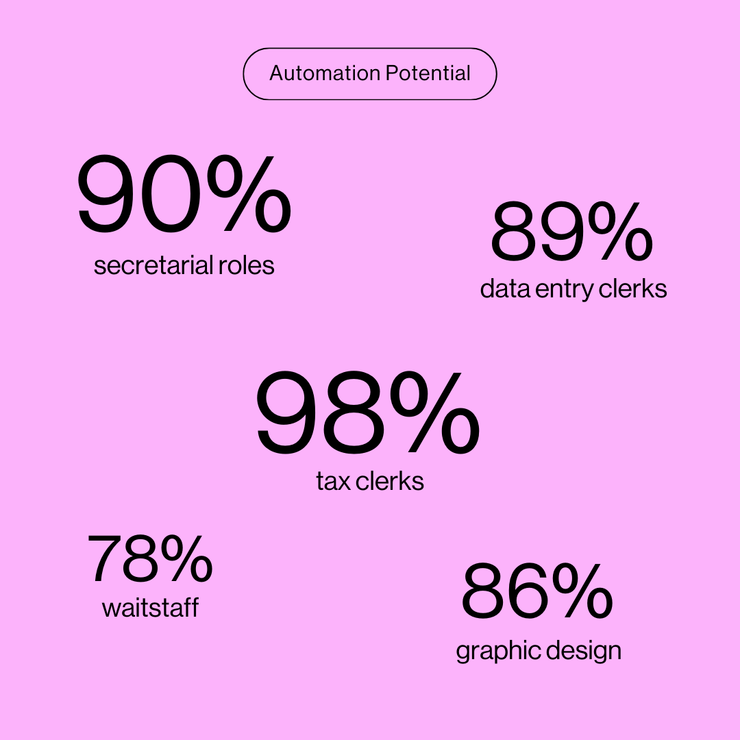 AI impacts all industries, from creative to administrative roles. For instance, graphic design has an automation potential of 86%, and secretarial roles are at 90% (by the way, both female-dominated job fields). Jobs involving repetitive or routine tasks are especially vulnerable, while even creative professions are being transformed by AI tools. This underscores the need to understand AI’s possibilities and limitations to remain competitive in the long term (Job-Futuromat, McKinsey).